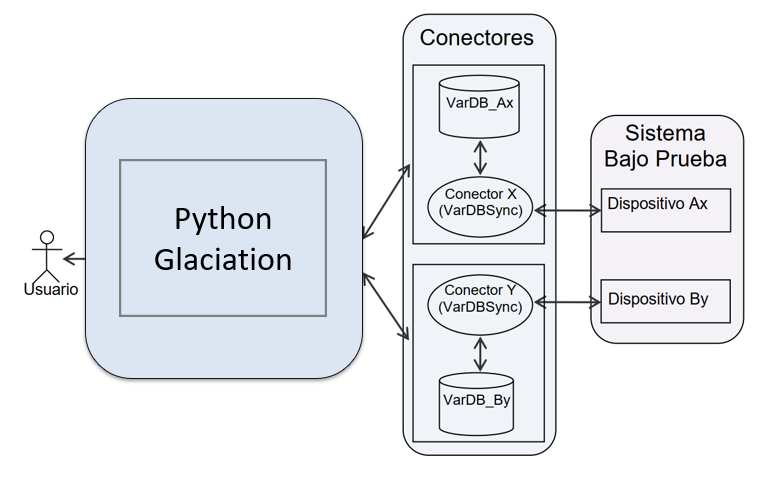 Glaciation connects to the system under test through one or more connectors. A connector creates a VarDB in the PC’s memory that keeps synchronized with the variables exposed by the target device. Glaciation is capable of reading and writing in that VarDB, which is the place where the data is exchanged between the connector and the Python script.
